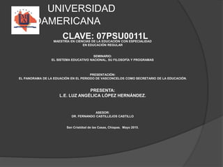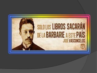 El documento describe las reformas educativas implementadas en México durante el periodo de José Vasconcelos como Secretario de Educación Pública entre 1922 y 1924. Vasconcelos impulsó programas para combatir el analfabetismo, expandir la educación rural e impulsar las bellas artes. Se establecieron escuelas primarias elementales y superiores con contenidos como lenguaje, aritmética, geografía e historia de México. También se fundaron las primeras escuelas normales rurales para formar maestros del campo.