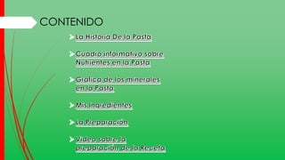 La pasta se refiere a alimentos preparados con masa de harina de trigo y agua, que generalmente se cuecen en agua hirviendo. El uso de la pasta parece haber empezado en China y luego se extendió por el mundo. La primera evidencia de fideos cocidos data del siglo V d.C. en Jerusalén.