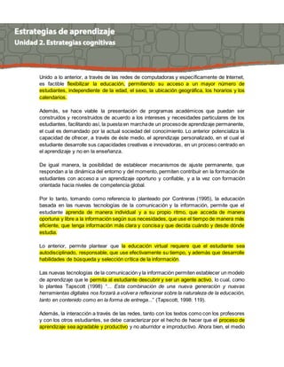 La educación virtual se centra en la responsabilidad del alumno en el proceso de aprendizaje, buscando información e interactuando con contenidos mediante tecnología. Además, se apoya en equipos de colaboración a través de redes para compartir experiencias. El desarrollo de estrategias metacognitivas por parte del estudiante puede ser una opción efectiva para el aprendizaje virtual.