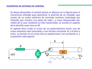 Este documento describe un sistema de control para posicionar la plumilla de un trazador utilizando un motor de corriente continua. El sistema consta de un potenciómetro lineal que mide la posición x de la plumilla y genera una tensión proporcional Vx. El documento proporciona parámetros del sistema como masas, constantes eléctricas y de par del motor. Luego, desarrolla un diagrama de bloques del sistema y obtiene su función de transferencia para analizar la respuesta del sistema.