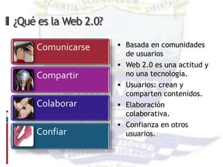 El documento describe la Web 2.0 y su aplicación en educación. La Web 2.0 se basa en la comunicación, el compartir y la colaboración entre usuarios que crean y comparten contenido. En educación, permite un aprendizaje sin barreras que es constructivista, colaborativo y fomenta la autonomía del estudiante y el trabajo en equipo bajo la guía del profesor.