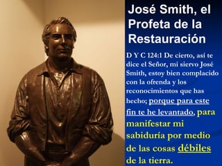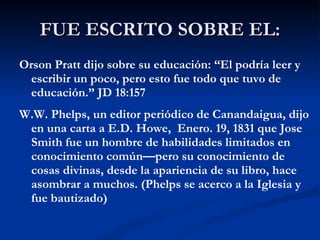 (1) El documento discute la vida y educación limitada de José Smith, el profeta del movimiento de los Santos de los Últimos Días. (2) También describe el proceso de traducción del Libro de Mormón en aproximadamente 75 días y el uso de estilos literarios semíticos como el paralelismo y el quiasmo. (3) Además, señala que José Smith incluyó detalles sobre la civilización mesoamericana y nombres semíticos en el Libro de Mormón que no eran conocidos ampliamente en su época.