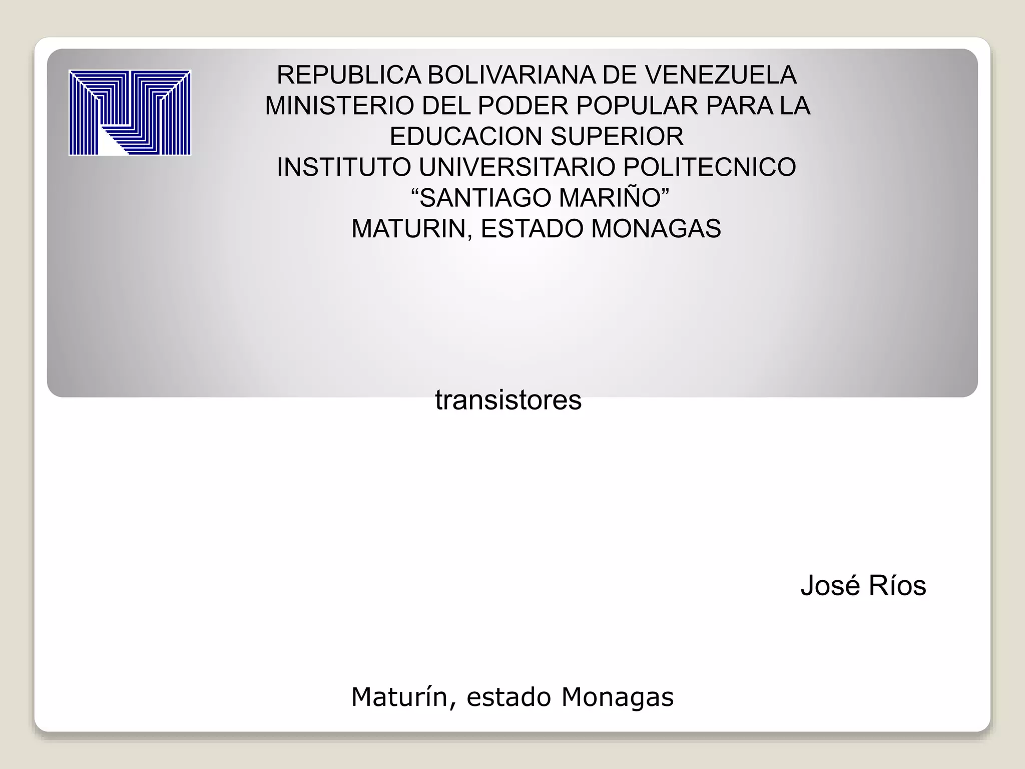 El documento es un reporte de la República Bolivariana de Venezuela sobre transistores escrito por José Ríos para el Instituto Universitario Politécnico "Santiago Mariño" en Maturín, estado Monagas.