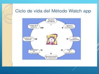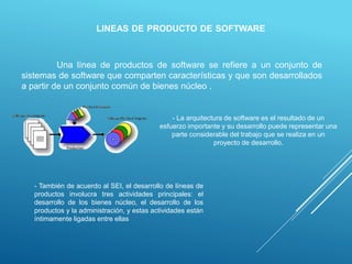 El documento describe el método WATCH y las líneas de productos de software. Explica que una línea de productos de software se refiere a un conjunto de sistemas que comparten características y son desarrollados a partir de activos fundamentales comunes. El método WATCH está orientado al desarrollo de aplicaciones empresariales y consta de tres componentes: un modelo de productos, un modelo de actores, y un modelo de procesos. El objetivo de las líneas de productos de software es aplicar los principios de producción en serie al desarrollo de
