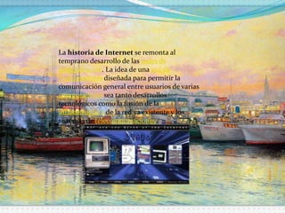 La historia de Internet se remonta a los años 1960 cuando Estados Unidos creó una red militar para mantener la comunicación en caso de un ataque nuclear. Esta red evolucionó para ser usada por universidades y el público y definir el protocolo TCP/IP. En los años 1990 empresas en Guatemala ofrecían servicios en redes locales que eventualmente se conectarían a Internet.