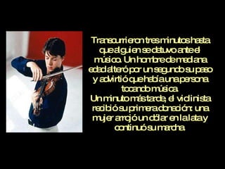 Un violinista de renombre mundial, Joshua Bell, tocó incógnito en una estación de metro en Washington D.C. durante 45 minutos interpretando obras complejas de Bach. A pesar de su talento, la mayoría de las personas que pasaron por la estación no se detuvieron a escuchar y sólo 27 personas donaron un total de $32. Más tarde se reveló que el violinista era Joshua Bell, valorado en $3.5 millones, lo que demuestra que a menudo no apreciamos la belleza cuando está fuera de contexto.