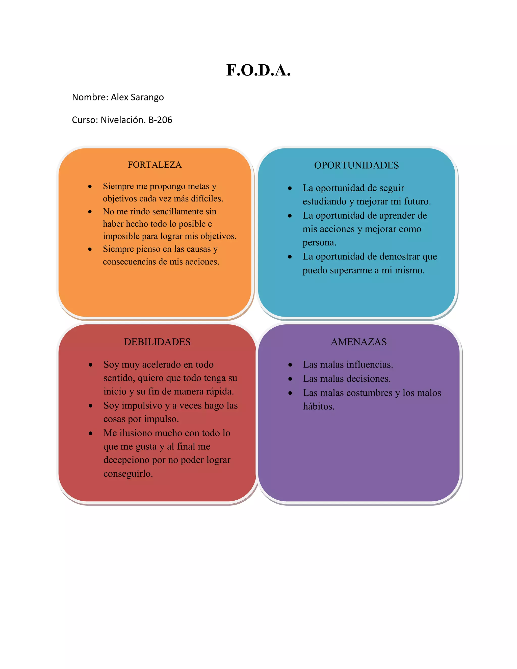 Alex Sarango realizó un análisis FODA sobre sí mismo donde identificó sus fortalezas como fijarse metas y objetivos cada vez más difíciles y no rendirse sin haber agotado todos los esfuerzos, sus oportunidades como seguir estudiando para mejorar su futuro y demostrar su capacidad de superación, sus debilidades como ser acelerado e impulsivo y ilusionarse demasiado, y sus amenazas como malas influencias, decisiones, costumbres y hábitos.