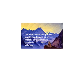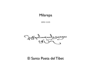 Este documento presenta una recopilación de frases y citas extraídas de los cantos de Milarepa, el santo poeta budista tibetano que vivió entre 1052-1135. Las citas están organizadas en temas como pasiones, fe, conocimiento, ética, dinero, karma, sentido de la vida y mente. El documento ofrece una visión de la sabiduría y enseñanzas de Milarepa sobre cómo alcanzar la iluminación y liberarse del sufrimiento de samsara.