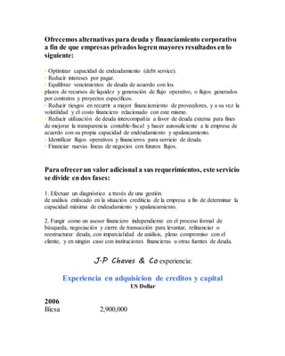 J.P Chaves & Co ofrece asesoría en deuda y financiamiento corporativo para ayudar a las empresas a optimizar su capacidad de endeudamiento, reducir costos de intereses, y equilibrar los vencimientos de deuda con los flujos de efectivo. La compañía ha levantado más de $140 millones de dólares en préstamos para clientes en los últimos 9 años a través de bancos y otras instituciones financieras.