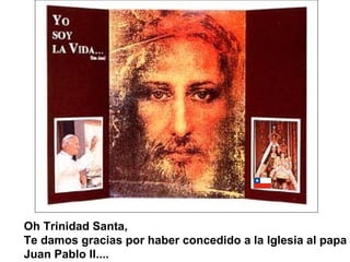 Este documento es una oración dirigida a la Santísima Trinidad para agradecer los dones concedidos a través del Papa Juan Pablo II y pedir su intercesión. La oración pide favores a través de Juan Pablo II, como la protección de las familias, y expresa la esperanza de que sea canonizado pronto como uno de los santos de la Iglesia Católica.