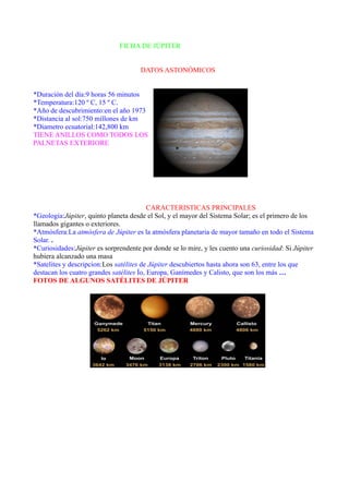 Júpiter es el quinto planeta desde el Sol y el más grande del Sistema Solar. Tiene una temperatura entre 120°C y 15°C, un diámetro ecuatorial de 142,800 km, y órbita el Sol a una distancia de 750 millones de km. Júpiter posee 63 lunas conocidas, incluyendo los 4 mayores satélites de Ganímedes, Calisto, Europa e Io.
