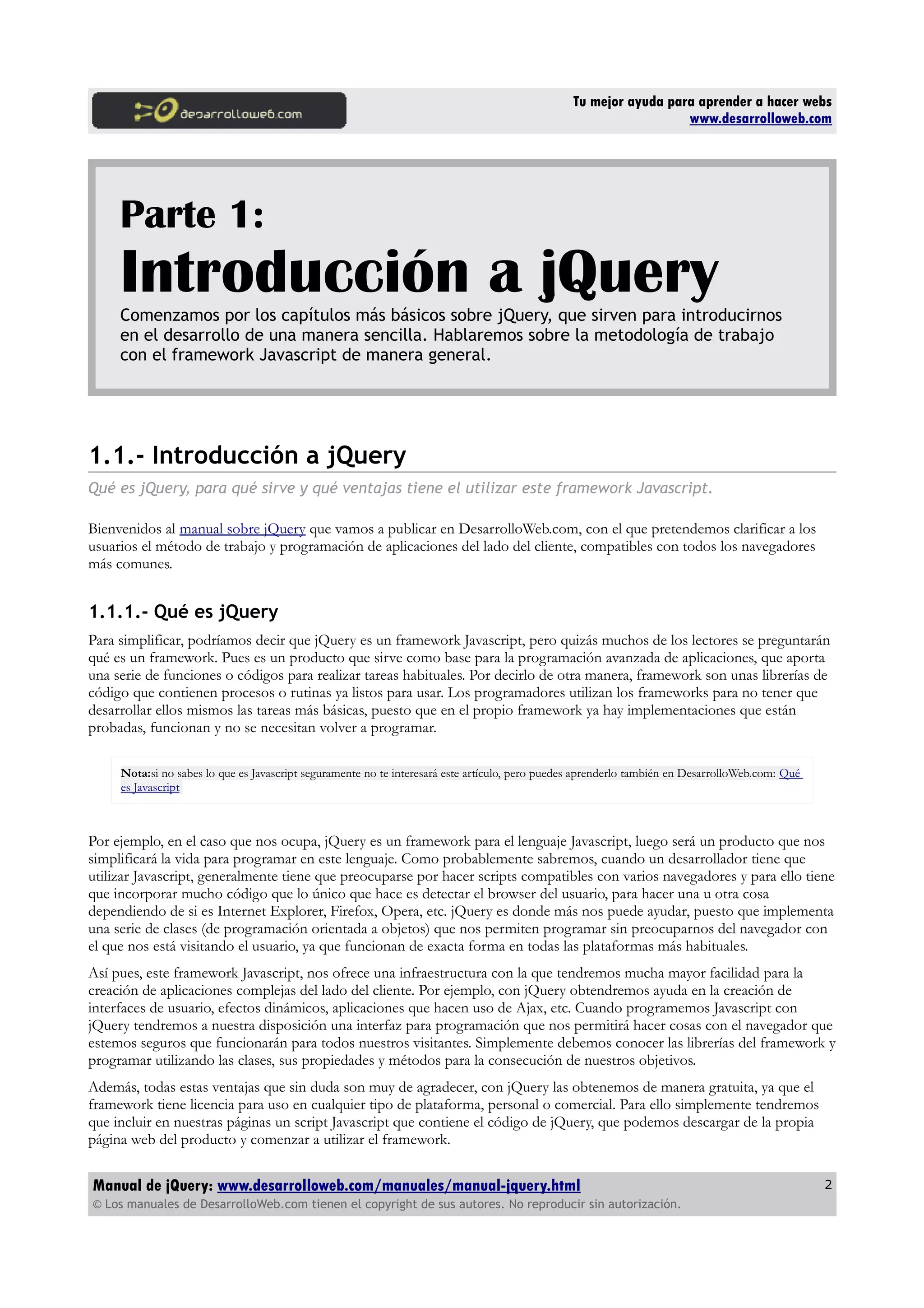 Este documento presenta un resumen de un manual sobre jQuery. Explica que jQuery es un framework JavaScript popular que simplifica el desarrollo de aplicaciones web avanzadas compatibles con todos los navegadores. El manual contiene 43 capítulos introduciendo conceptos básicos de jQuery y fue escrito por Miguel Angel Alvarez para el sitio web DesarrolloWeb.com. Incluye ejemplos simples de uso de jQuery para cambiar texto al hacer clic en botones.