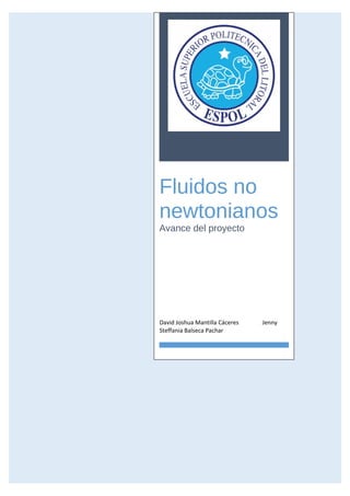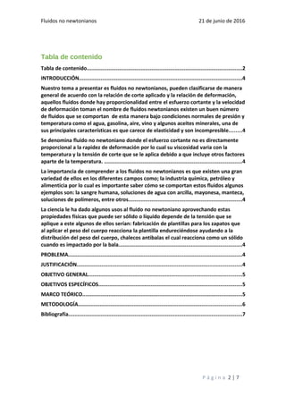Este documento presenta un proyecto sobre fluidos no newtonianos. Introduce el tema y explica la diferencia entre fluidos newtonianos y no newtonianos. Identifica algunos ejemplos comunes de fluidos no newtonianos como la sangre humana y la mayonesa. También describe algunos usos de estos fluidos en productos como plantillas para zapatos y chalecos antibalas. El objetivo del proyecto es elaborar equipos de protección utilizando fluidos no newtonianos para reducir lesiones en deportes.