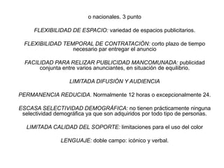 Este documento describe varias características de los suplementos como medio publicitario. Comparte características con la prensa diaria como la flexibilidad geográfica y credibilidad local, pero también comparte limitaciones como la gran competencia. Se distribuyen junto a los periódicos pero permiten segmentar la audiencia. El número de lectores de suplementos ha variado entre 11 y 12 millones en los últimos 10 años.