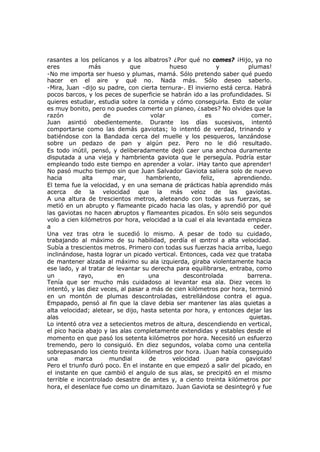 Juan Salvador Gaviota practica vuelos a baja altura y aprende sobre la aerodinámica, lo que desanima a sus padres que creen que debería comportarse como las demás gaviotas y enfocarse en conseguir comida. Juan sufre varios fracasos al intentar volar a alta velocidad hasta que descubre que doblando las alas puede volar más rápido y con mayor control. Ahora está decidido a seguir aprendiendo sobre el vuelo.