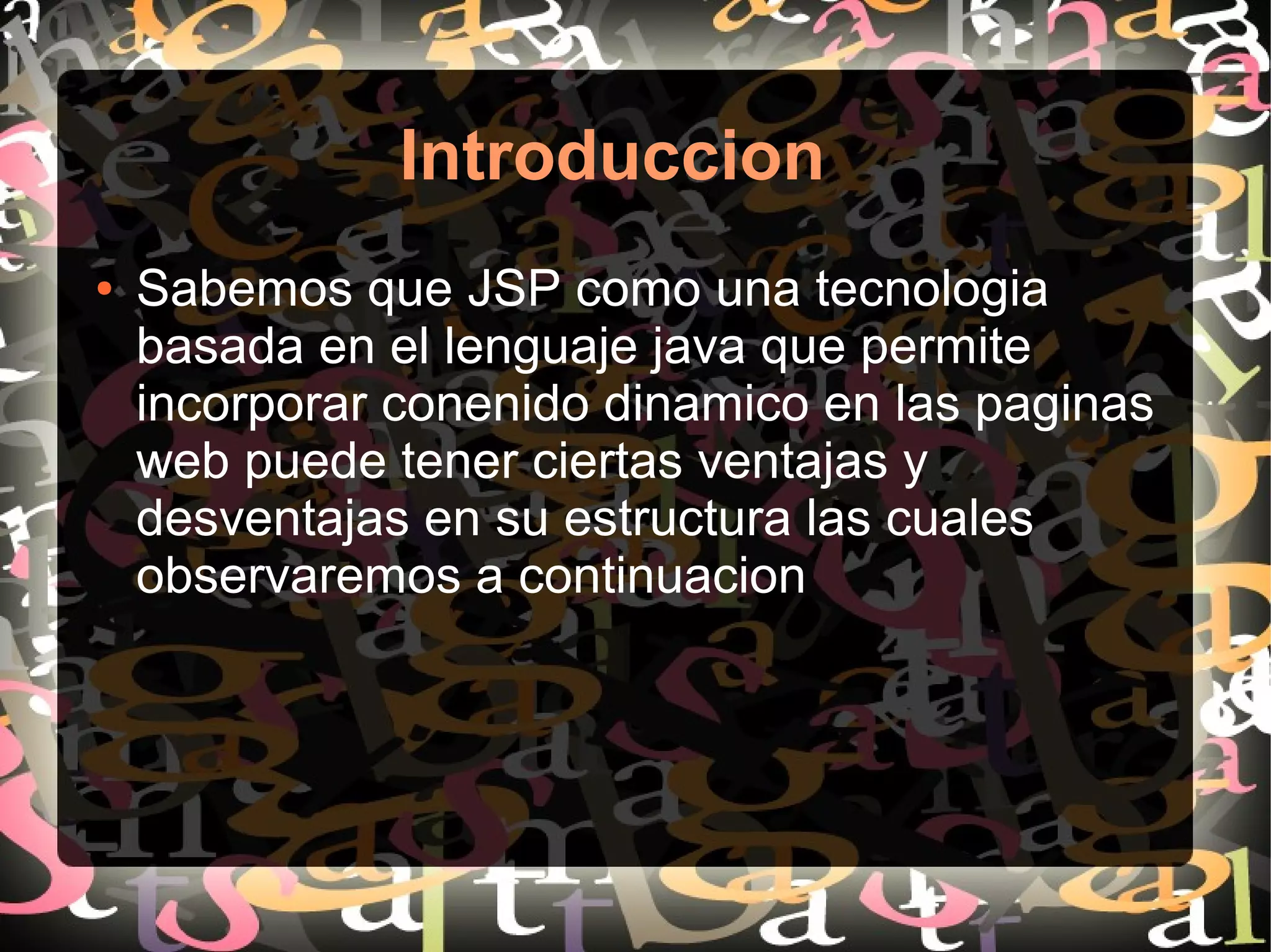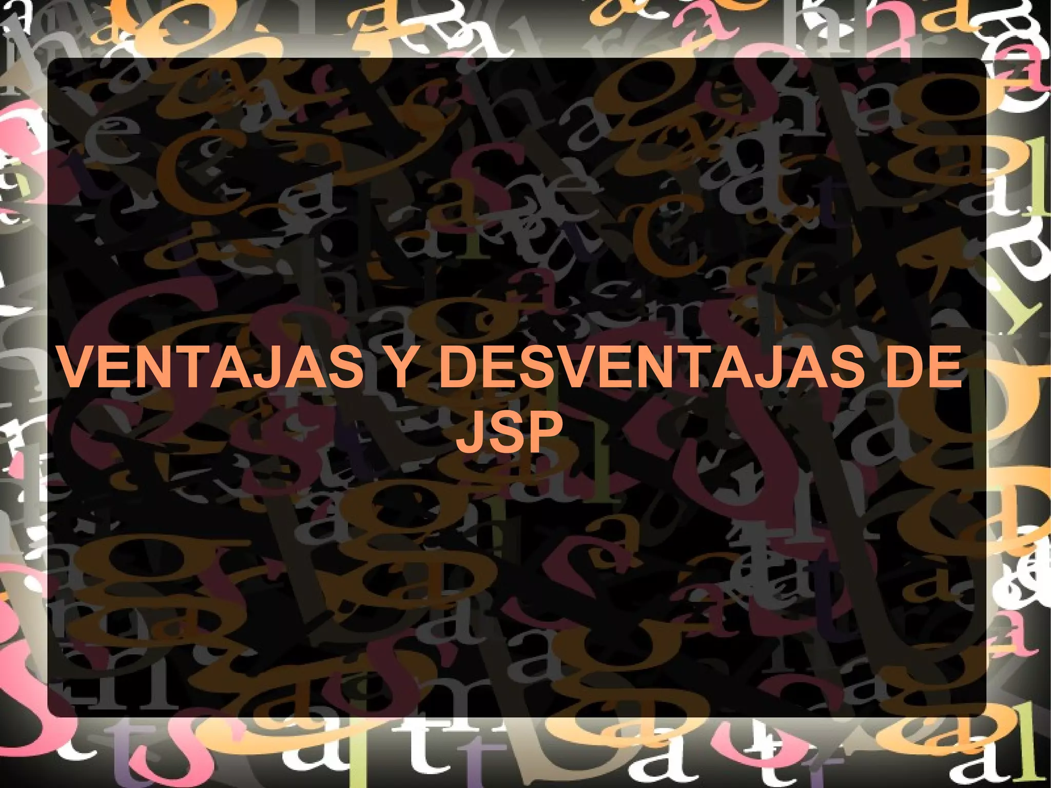JSP tiene ventajas como ser un lenguaje totalmente en Java, tener una fuerte capacidad de manipulación de gráficos, aprovechar APIs y ser de código abierto, pero también tiene desventajas como poseer una interfaz limitada, requerir muchas líneas de código para interfaces elaboradas y tener un riesgo de sobrecargar el servidor.