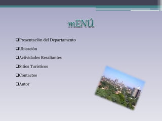 Este documento presenta información sobre la ciudad de Asunción, capital de Paraguay. Resalta que Asunción se encuentra ubicada en la orilla izquierda del río Paraguay y cuenta con más de 500,000 habitantes. Describe algunas de las principales actividades culturales y sitios turísticos de la ciudad, incluyendo teatros, bibliotecas, universidades, la estación de ferrocarril y el jardín botánico. Finalmente, proporciona contactos del autor.