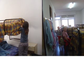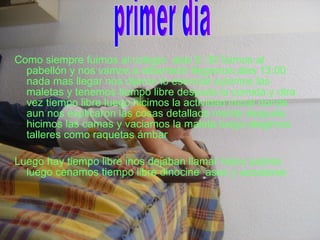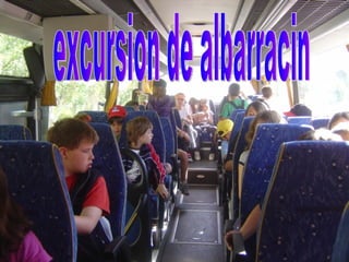 El documento describe el itinerario de una excursión escolar de 5 días en Albarracín, incluyendo actividades como visitas arqueológicas, talleres, clases y tiempo libre. Cada día comenzaba con el desayuno y hacer las camas, seguido de actividades educativas y recreativas, luego la comida, más tiempo libre y cena antes de acostarse. El quinto día terminó con el regreso en autobús a Sammateo.