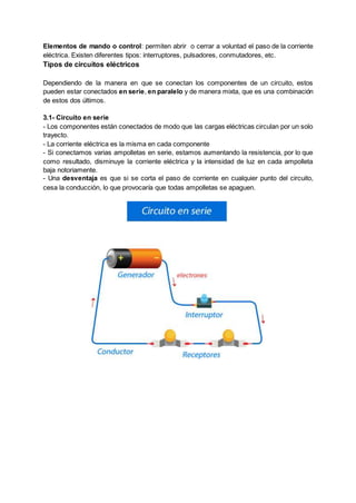 Un circuito eléctrico es un conjunto de elementos conectados entre sí que permiten el paso de corriente eléctrica. La corriente eléctrica es el movimiento de electrones. Un circuito típico contiene un generador, conductores y receptores. Existen circuitos en serie, donde la corriente pasa por un solo camino, y circuitos en paralelo, donde existen múltiples caminos para la corriente.