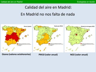 El documento habla sobre la calidad del aire en Madrid. Explica que la principal causa de la contaminación atmosférica en las ciudades es el tráfico. Para mejorar la calidad del aire se requiere reducir el tráfico a través de cambios en la mentalidad y los hábitos de los ciudadanos, así como implementar medidas permanentes para disminuir el número de coches. La operación Gran Vía, que restringió el tráfico en diciembre, logró reducir los niveles de contaminación, mostrando que menos coches se traduce