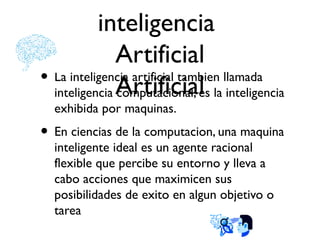Este documento trata sobre inteligencia artificial. Define la inteligencia artificial como la inteligencia exhibida por máquinas, y describe cómo una máquina inteligente ideal es un agente racional que percibe su entorno y toma acciones para maximizar su éxito. También resume las categorías de inteligencia artificial, la historia del campo, aplicaciones comunes y algunos investigadores clave.