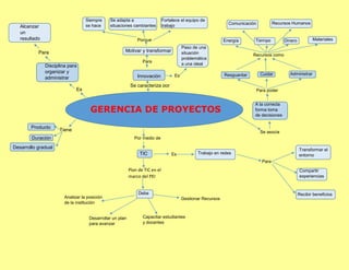 La gerencia de proyectos es una disciplina para organizar y administrar recursos como energía, tiempo, dinero y materiales con el fin de alcanzar un resultado o producto de manera gradual a través del desarrollo. Se caracteriza por la innovación y la motivación para transformar situaciones, adaptándose a cambios y fortaleciendo el equipo de trabajo a través de la correcta toma de decisiones y la administración de recursos humanos y de comunicación.