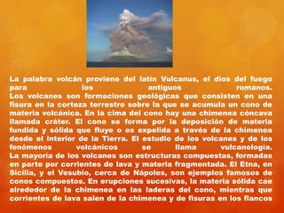 Este documento trata sobre volcanes alrededor del mundo. Explica que un volcán es una formación geológica que consiste en una fisura en la corteza terrestre sobre la que se acumula un cono de materia volcánica. Además, menciona algunos de los volcanes más importantes como el Etna y el Vesubio, y describe brevemente cómo se forman los conos volcánicos a través de erupciones sucesivas.