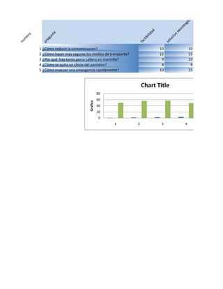 Este documento presenta cinco preguntas frecuentes con sus respectivos números de visitas y tiempo promedio de visita. La pregunta sobre cómo evacuar una emergencia rápidamente recibió el mayor número de visitas y tiempo de visita promedio, mientras que la pregunta sobre por qué hay tantos perros callejeros en una ciudad recibió las menores métricas. El documento también incluye un gráfico que muestra el tiempo de visita promedio para cada pregunta.