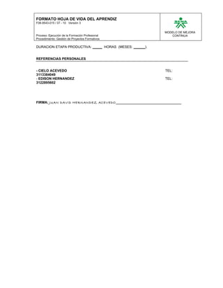 Este documento presenta el formato de hoja de vida de un aprendiz, Juan David Hernández Acevedo, que incluye sus datos personales, estudios, experiencia laboral y referencias personales. La hoja de vida proporciona información básica sobre el aprendiz como su nombre, identificación, fecha de nacimiento, domicilio, estudios primarios y secundarios, especialidad de estudios complementarios actual y duración de la etapa productiva.
