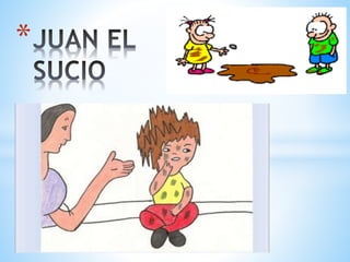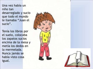 Juan el sucio era un niño desordenado hasta que el hada ordenada limpió y ordenó su habitación. Le dijo a Juan que fuera al jardín a esperar a su hermano. Allí conoció a varios animales como una ardilla, un pájaro y un gato, pero ninguno quería ser su hermano. Finalmente llegó un cerdito que dijo ser su hermano, pero Juan no quería ensuciarse con él. El hada le ofreció a Juan aprender a ser limpio y ordenado, a lo que accedió. Desde entonces, Juan