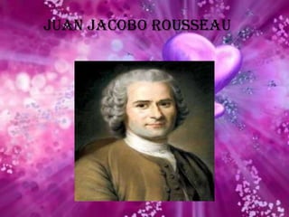 Juan Jacobo Rousseau fue un filósofo suizo nacido en 1712 que murió en 1778. Escribió obras importantes como El contrato social y Emilio que influyeron en la Revolución Francesa. Propuso que el estado moderno debería ser democrático y expresar la voluntad general de los ciudadanos. También sugirió que el ser humano es bueno por naturaleza y que la sociedad corrompe esta bondad innata.