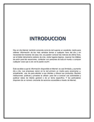 El documento habla sobre los servicios web e Internet. Explica que Internet permite acceder a información de forma rápida y gratuita sobre varios temas. También describe el origen y evolución de Internet desde la red ARPANET en los años 60 hasta el desarrollo de la World Wide Web a finales de los 80. Finalmente, resume algunas ventajas y desventajas de sitios web como blogs y la "Internet profunda".