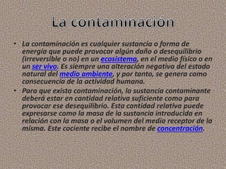 La contaminación se produce por la actividad humana y puede dañar el medio ambiente de forma irreversible. Los contaminantes incluyen desechos industriales, combustibles fósiles y basura, y se clasifican como sólidos, líquidos o gaseosos. A medida que crece la población mundial y el consumo, también lo hace la contaminación ambiental, la cual amenaza el equilibrio ecológico de la Tierra.