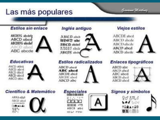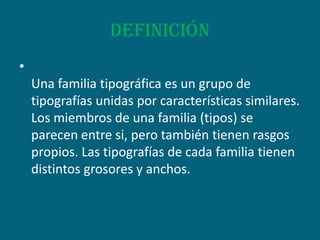 Este documento habla sobre las familias tipográficas y su clasificación. Explica que una familia tipográfica es un grupo de tipos con características similares pero también rasgos propios. Las tipografías de cada familia tienen distintos grosores y anchos. También describe brevemente la evolución del arte de la tipografía y algunas clasificaciones ampliadas de familias tipográficas como serif slab, sans serif tensionado y monoespaciada. Finalmente, menciona las variantes de estilo de versalitas y números antig