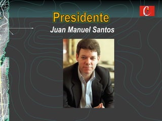 Juan Manuel Santos fue ministro de Comercio Exterior, Hacienda y Defensa. Tiene maestrías de la London School of Economics y Harvard. Su plan de gobierno busca lograr un desarrollo económico equitativo mediante la generación de empleo, disminución de la pobreza y consolidación de la seguridad. Sus objetivos incluyen aumentar la inversión extranjera, mejorar la infraestructura y ampliar la cobertura educativa.
