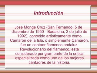 Introducción José Monge Cruz (San Fernando, 5 de diciembre de 1950 - Badalona, 2 de julio de 1992), conocido artísticamente como Camarón de la Isla, o simplemente Camarón, fue un cantaor flamenco andaluz. Revolucionario del flamenco, está considerado por gran parte de la crítica especializada como uno de los mejores cantaores de la historia.