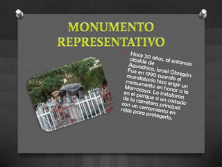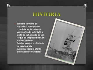 Aguachica se ubica en el sur del departamento de Cesar, Colombia, entre la Cordillera Oriental y el valle del Río O. La ciudad se empezó a consolidar en el siglo XVIII a partir de la hacienda de San Roque. Actualmente, el parque principal de Aguachica se encuentra en la Calle 5 entre Carreras 10 y 11, donde se realizan las tradicionales Fiestas de San Roque. El Cerro de la Cruz es un mirador turístico importante de la ciudad conocido por las celebraciones religiosas que ocurren allí cada 3 de may