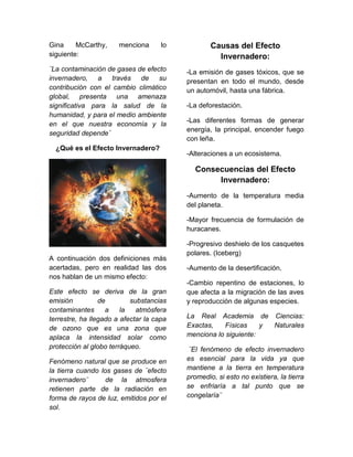 Este documento explica el efecto invernadero, describiéndolo como un fenómeno natural que retiene la radiación del sol y mantiene la temperatura de la Tierra, pero que se ha visto afectado por las emisiones humanas de gases de efecto invernadero. Estas emisiones están causando un aumento de la temperatura global con consecuencias como el deshielo de los polos, huracanes más frecuentes y la desertificación. Se insta a reducir las emisiones para limitar el daño al medio ambiente y la vida en la
