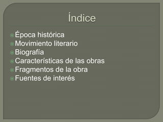 Este documento resume el movimiento literario del modernismo en España en el siglo XX, incluyendo las características principales y la biografía del poeta Juan Ramón Jiménez. También presenta fragmentos de su obra más conocida, "Platero y yo", y proporciona fuentes bibliográficas e webgráficas de interés sobre el tema.