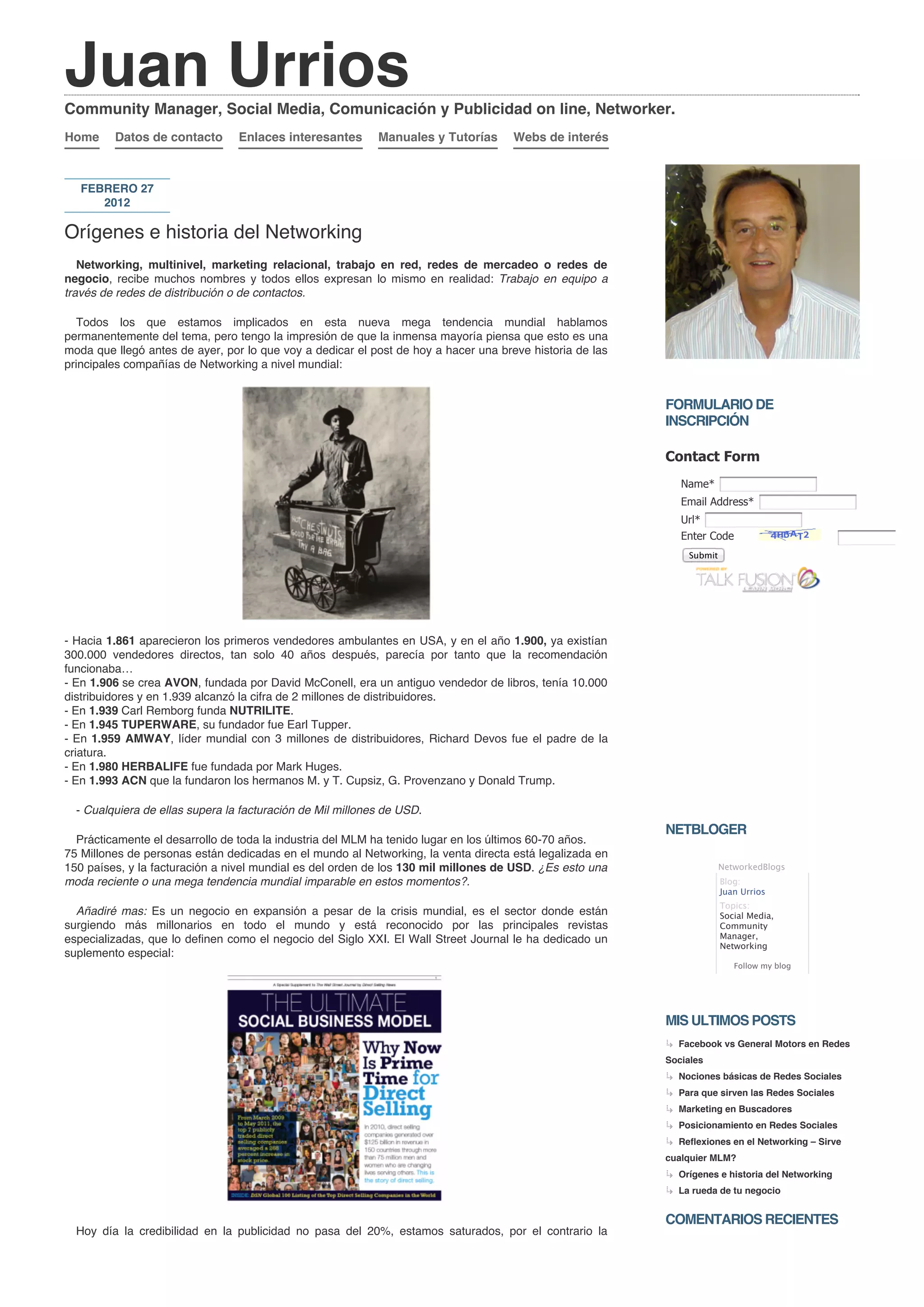 Este documento proporciona un resumen histórico del networking y las compañías multinivel, destacando que surgieron en EE.UU. en el siglo XIX y se expandieron globalmente en el siglo XX, alcanzando ventas anuales de 130 mil millones de dólares y 75 millones de personas dedicadas a ello. También analiza cómo la credibilidad en la publicidad es baja, mientras que la recomendación entre contactos es alta, haciendo del networking una oportunidad en la actualidad.