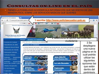 El documento habla sobre los servicios que se pueden acceder en línea a través de portales de identidad. Explica que los servicios en línea pueden ser prestados electrónicamente por empresas u organizaciones y menciona algunos ejemplos como servicios de agua potable, eléctricos y de información tributaria que se pueden consultar en línea.