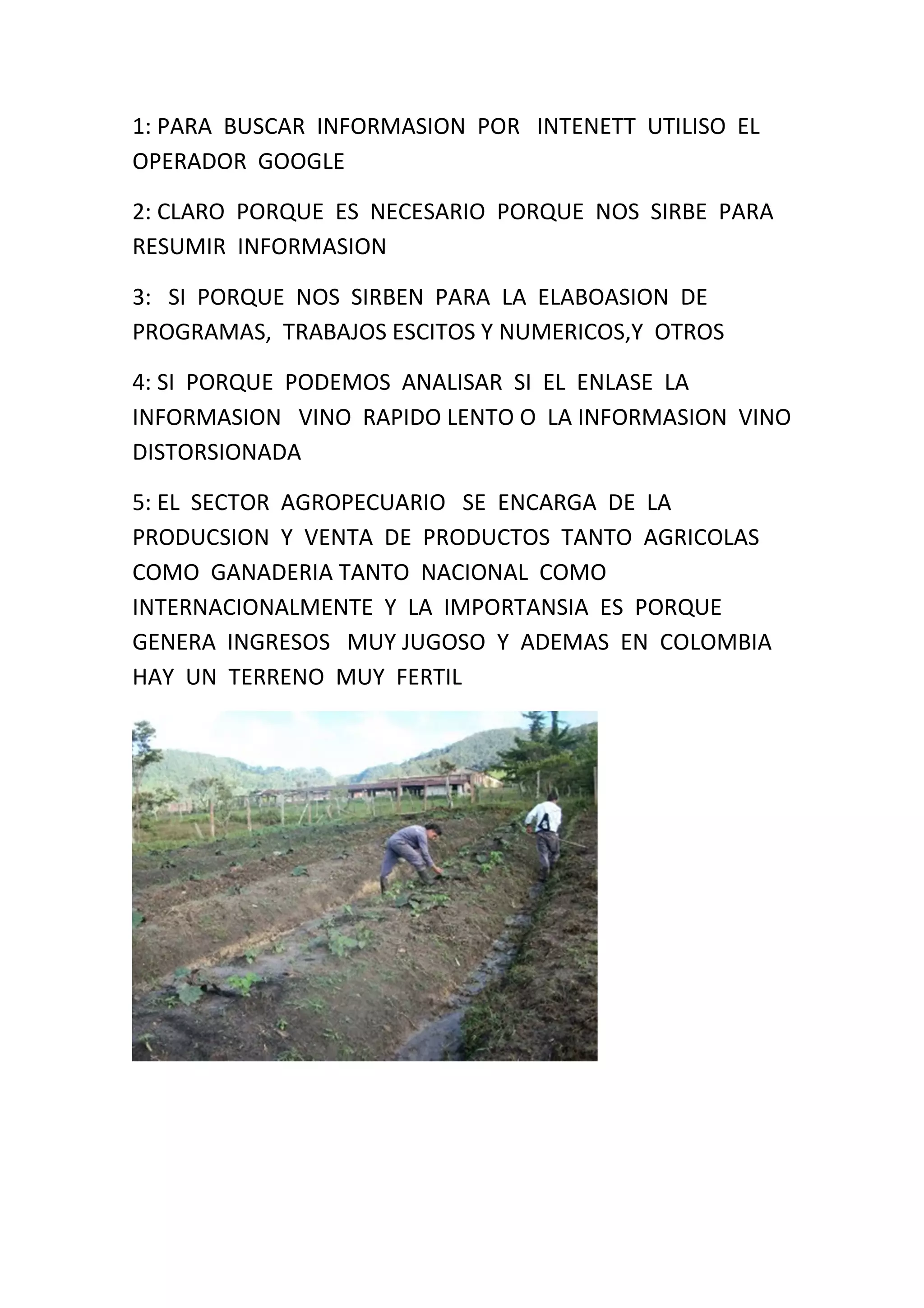 El documento habla sobre usar Google para buscar información en Internet y cómo esto nos ayuda en la elaboración de trabajos y proyectos. También menciona que el sector agropecuario se encarga de la producción y venta de productos agrícolas y ganaderos a nivel nacional e internacional, y es importante porque genera ingresos significativos y Colombia tiene tierras fértiles.