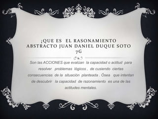 El documento habla sobre el razonamiento abstracto y la creatividad. El razonamiento abstracto evalúa la capacidad de resolver problemas lógicos deduciendo consecuencias de situaciones planteadas. La creatividad es la generación de ideas nuevas, originales y útiles, y todos nacemos con capacidad creativa. La creatividad también sirve como antídoto contra el aburrimiento en la vida diaria.