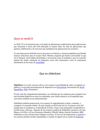 La Web 2.0 es una transición hacia aplicaciones basadas en la web enfocadas en el usuario final que fomentan la colaboración y reemplazan aplicaciones de escritorio. SlideShare permite compartir presentaciones de diapositivas, documentos y otros archivos. Blogger es un servicio de Google para crear y publicar blogs en línea sin necesidad de código. Scribd permite compartir documentos en varios formatos y embebedarlos en páginas web.