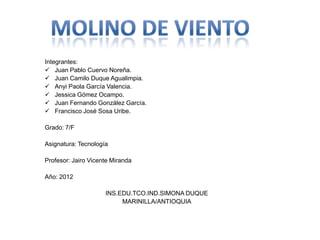 Este documento presenta un proyecto realizado por 6 estudiantes del grado 7/F sobre molinos de viento. El objetivo del proyecto era generar energía eléctrica para personas de bajos recursos mediante la construcción de un molino de viento. El documento explica qué son los molinos, para qué sirven, y clasifica los molinos por su posición del eje, número de palas, potencia y otros factores. El equipo planeaba construir su molino con una hélice que al moverse con el viento encendería un led.