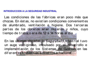 El documento describe las malas condiciones de trabajo que surgieron con la Revolución Industrial, incluyendo jornadas laborales largas de 12-14 horas al día, falta de sistemas de agua e higiene, y chozas en lugar de fábricas, lo que ocasionaba muchas muertes y lesiones. También señala que en décadas recientes la seguridad industrial ha crecido gracias al desarrollo e implementación de sistemas de gestión en diferentes industrias a nivel internacional.