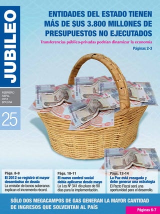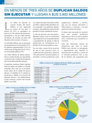 El documento describe que las entidades del sector público boliviano tienen más de $us 3,800 millones en presupuestos no ejecutados, principalmente los gobiernos subnacionales. Esto revela las limitaciones del sector público para ejecutar su presupuesto y diversificar la economía a través de la inversión productiva. Las transferencias público-privadas surgen como una opción para dinamizar la economía mediante el concurso del sector privado, aunque existen desafíos en su implementación y regulación.