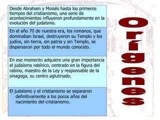 El documento proporciona información sobre el origen y las características principales del judaísmo. Explica que se separó del cristianismo después del nacimiento de este, y que tras la destrucción del Templo en el año 70 d.C., el judaísmo rabínico centrado en la Torá y la sinagoga ganó importancia. También describe las principales corrientes del judaísmo como el ortodoxo, conservador, reformista y humanista secular, así como elementos clave como los Mandamientos, las oraciones y festividades más importantes