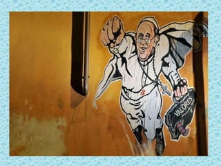 El documento habla sobre la carta de Judas y los falsos maestros que se infiltran en la iglesia. Advierte sobre los que se quejan y critican todo para sacar provecho, y como andan libremente aunque no tienen el Espíritu. El antídoto es la oración, el amor y esperar en la misericordia de Cristo. También resume declaraciones del Papa Francisco sobre limpiar la Iglesia de abusos y pedófilos, aunque recientemente ha hecho comentarios que causan confusión sobre temas como el infierno y Adán