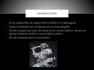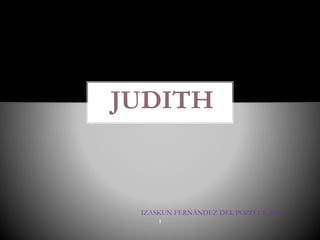 El libro de Judith es un antiguo texto bíblico incluido en la Septuaginta y aceptado por algunas iglesias cristianas. Narra la historia de Judith, una viuda hebrea que emborracha y decapita al general enemigo Holofernes para darle la victoria a Israel. Se cree que fue escrito de forma anónima durante el siglo II a.C. como una novela histórica para exaltar el patriotismo y la piedad religiosa.